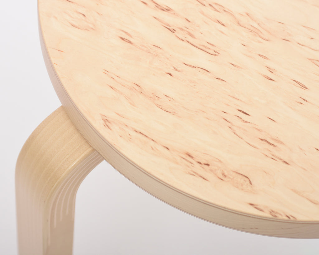 The three-legged Stool 60, designed by Alvar Aalto in 1933, is a classic piece that is made from Finnish birch. Stool 60 is a versatile piece of furniture that can be used both as a seat and a small table. The stool is easy to stack, making it a practical solution for small spaces. This special version has a curly birch seat. The product is available in natural lacquered and honey-stained finishes. Limited availability.